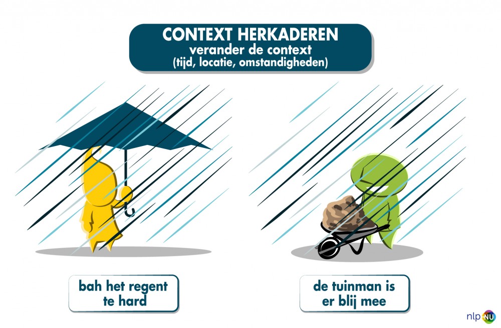 Herkaderen kennen we als het geven van een andere betekenis aan een verschijnsel. We kunnen herkadertechnieken inzetten wanneer we belemmerende overtuigingen tegenkomen die we graag willen doorbreken. Aangezien elke betekenis context afhankelijk is kunnen we spelen met de context. Dus spelen met het kader. We zullen merken dat inhoud en betekenis zal meeveranderen. De basis van herkaderen is: het scheiden van intentie en gedrag. Door iets te herkaderen gaan we er anders naar kijken. Zo'n typisch veelgebruikte herkadering in het bedrijfsleven is: "er zijn geen problemen, alleen maar uitdagingen". Voel maar eens bij jezelf: het nadenken over problemen geeft een andere energie dan het nadenken over een uitdaging om jezelf te overtreffen.